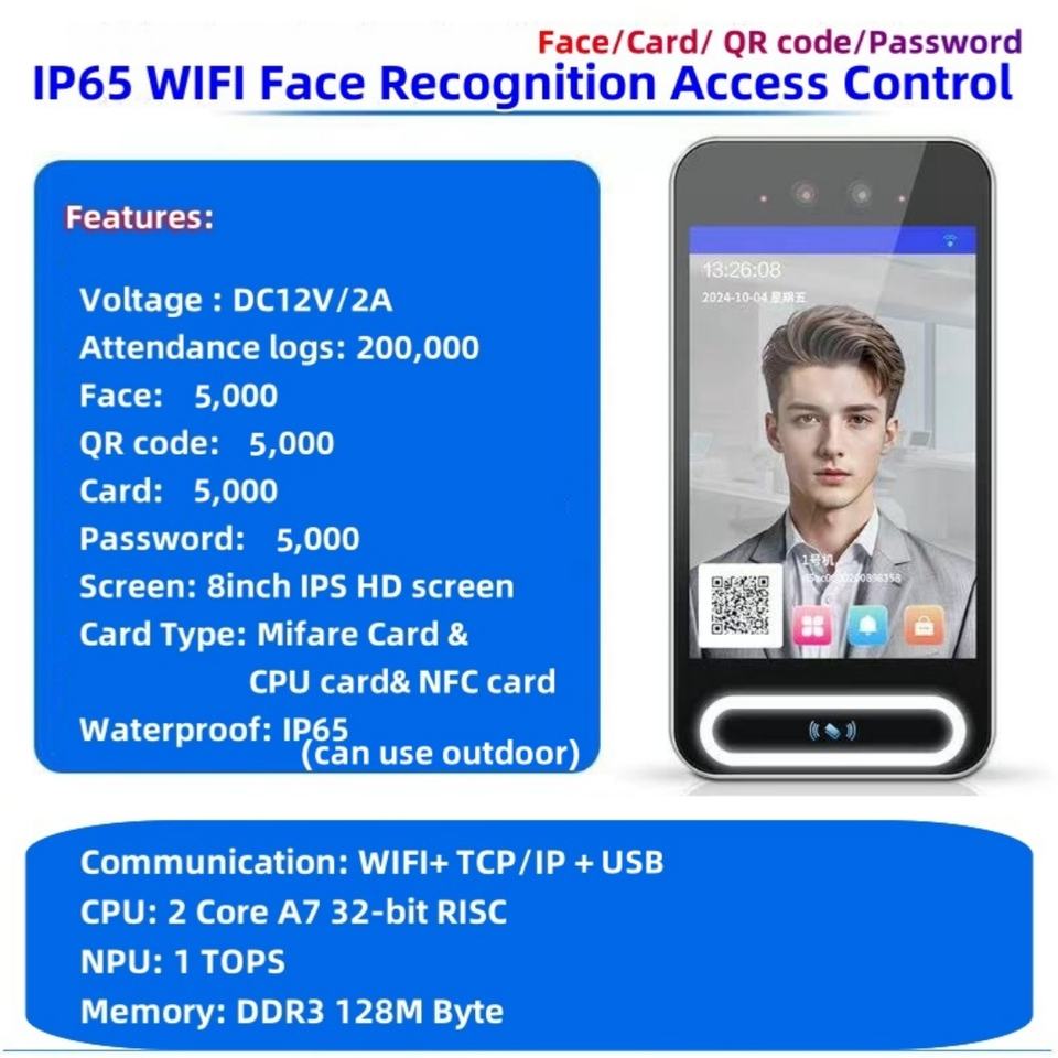 Método de apertura de la puerta:1. reconocimiento facial; 2. contraseña; 3. tarjeta; Código 4. QR
