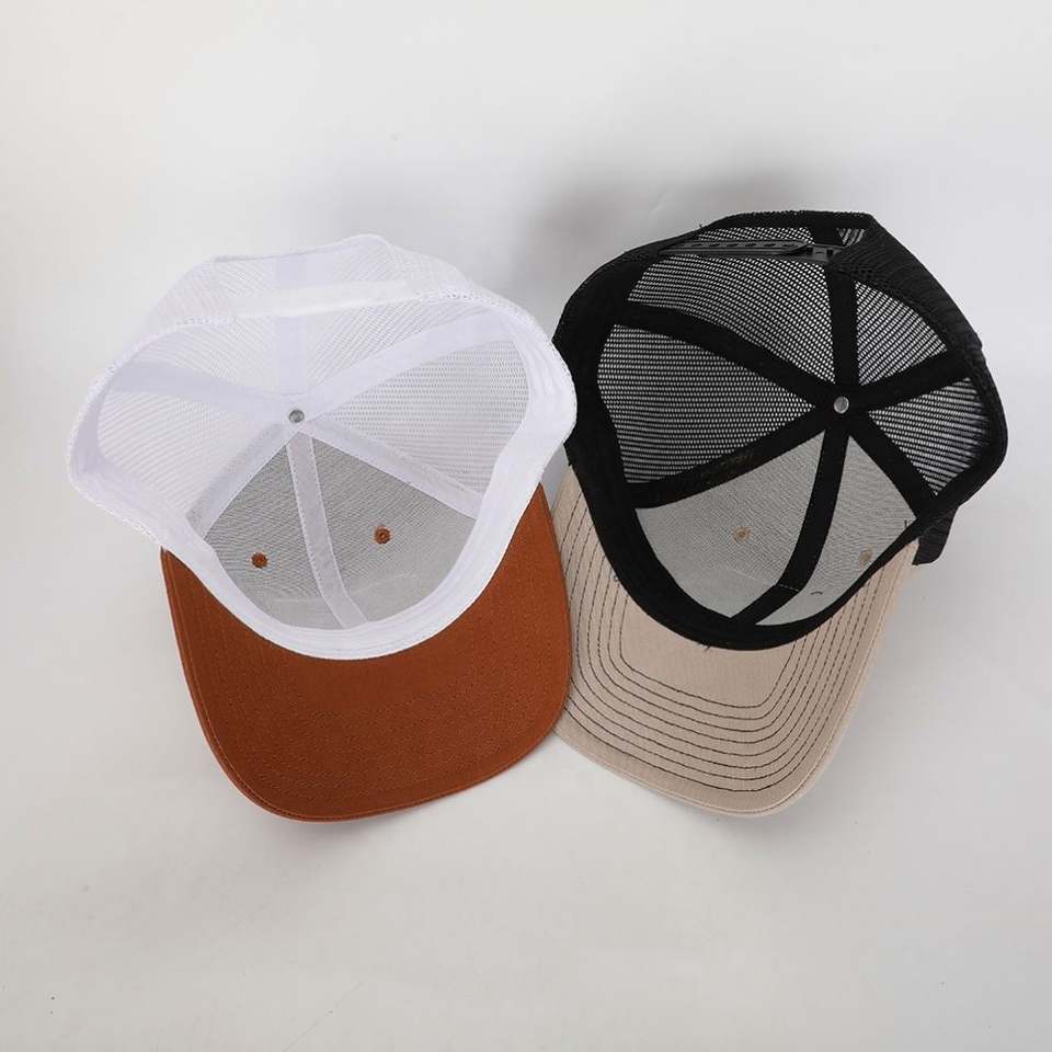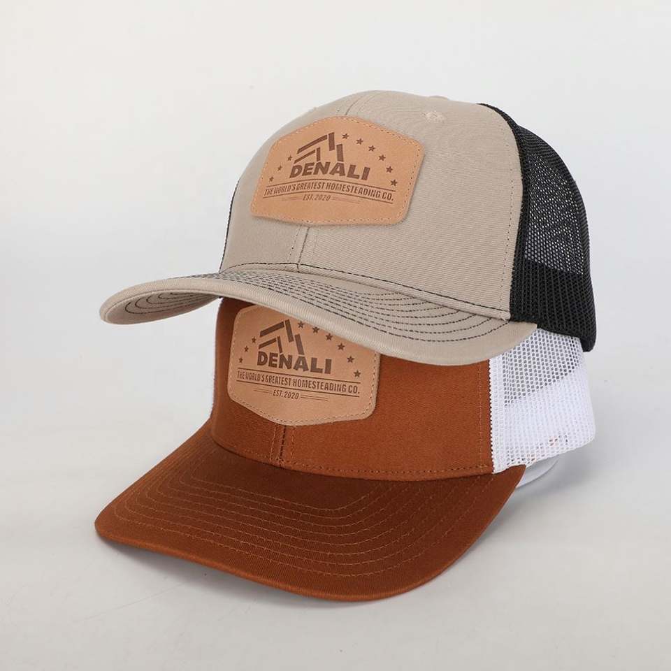 BSCI OEM, venta al por mayor, logotipo de parche de cuero de alta calidad personalizado, sombrero deportivo de 6 paneles para papá, Gorras de algodón marrón, gorra de camionero de moda para hombre