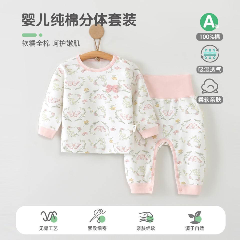 Conjunto de Dos Piezas para Bebé, Otoño, Algodón Puro, Cintura Alta, Cubre el Vientre, Cálido, Absorbe la Humedad, Suave, Top y Pantalones para Niños