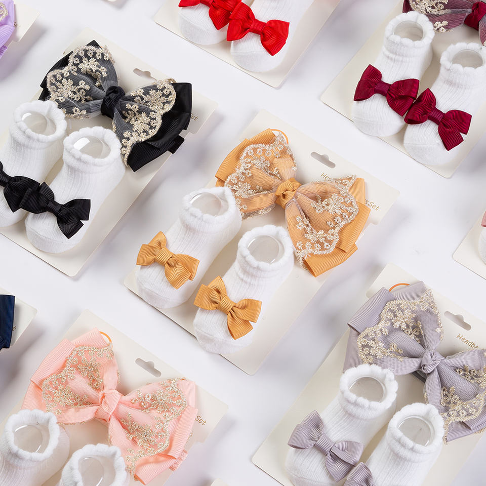 Juego de diadema y calcetín con lazo de encaje de hilo dorado para bebé, regalo lujoso para bebé que incluye calcetines cómodos