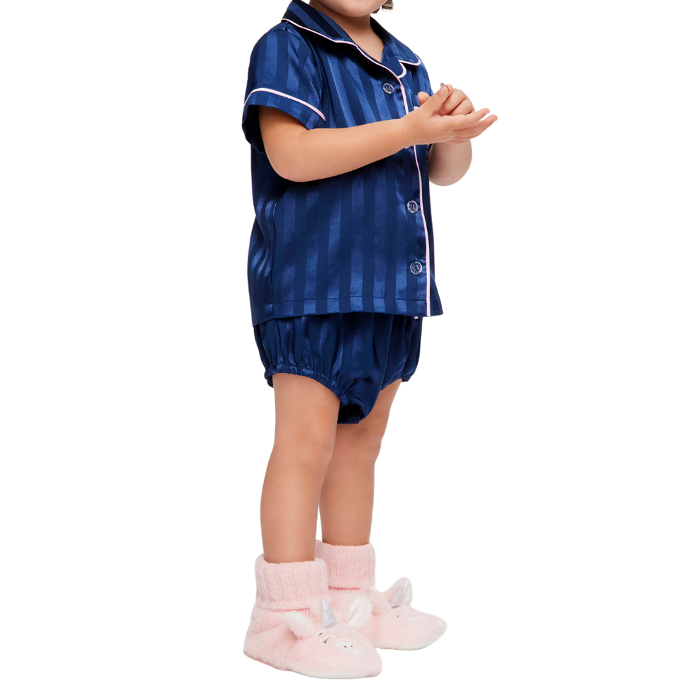Conjunto de Pijama Clásico de Dos Piezas de Satén Azul Marino para Bebé, Ropa de Dormir Suave, Lisa, Sedosa y Ligera