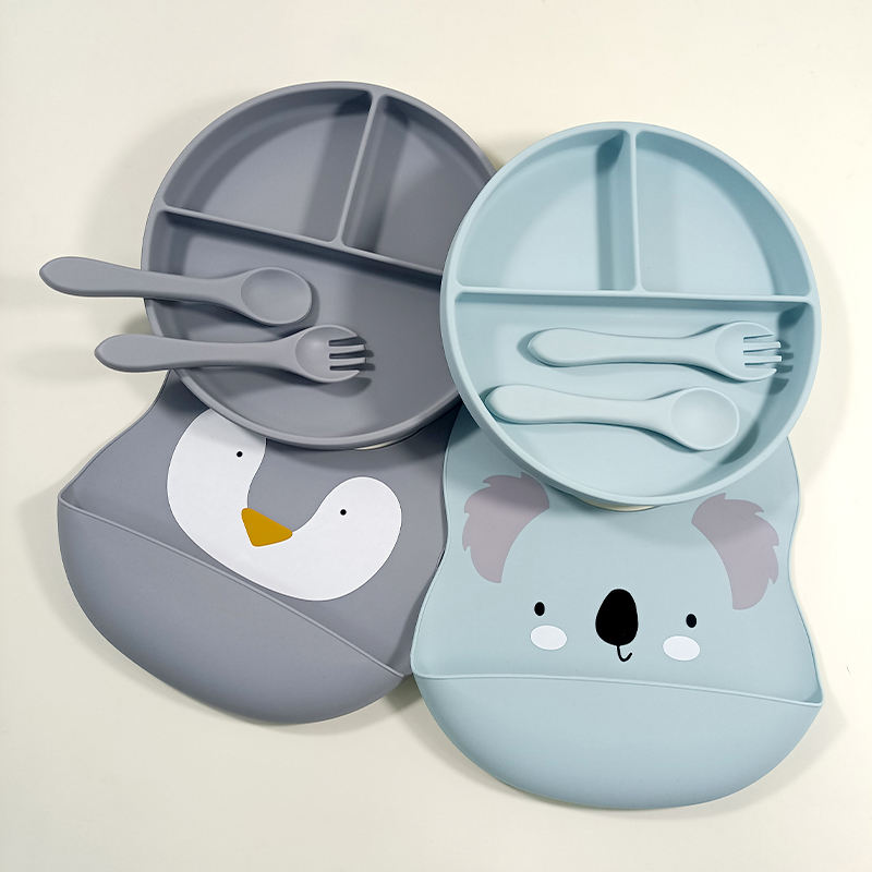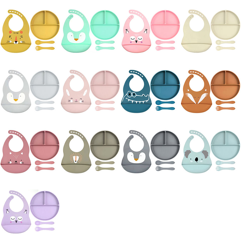 Juego de alimentación de silicona para bebé, vajilla infantil, juego de comedor, plato de oso, cuenco con patrón, babero, cubiertos de acero inoxidable, logotipo personalizado