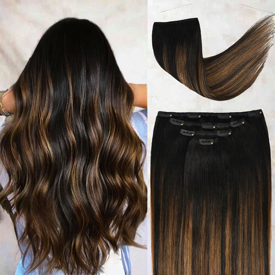 Extensiones de Cabello Remy con Clip Balayage para Mujer, 7 Piezas/Juego, Negro Natural, Castaño, Doble Trama a Máquina, 100g