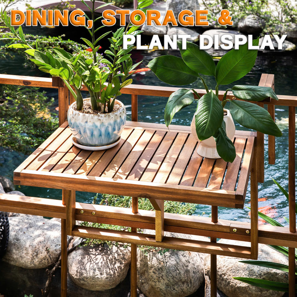Mesa colgante para balcón diseñada para fijarse de forma segura a barandillas, lo que proporciona una superficie que ahorra espacio para bebidas y comidas.