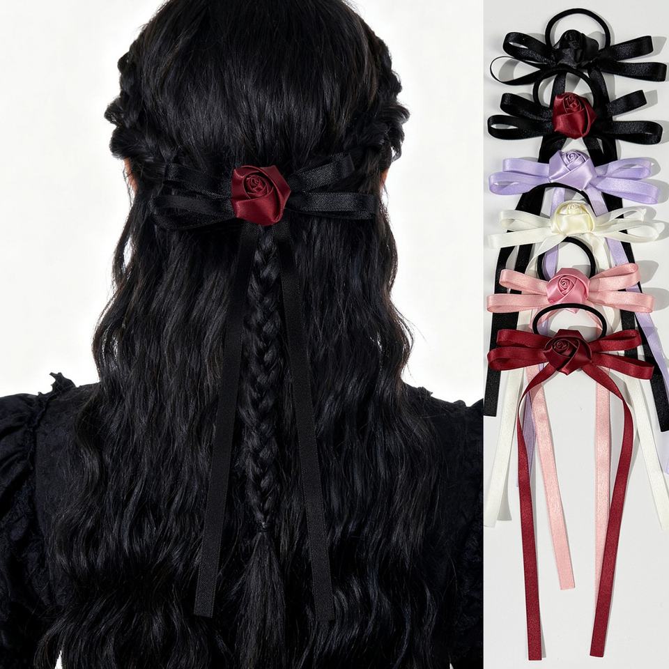 Lazo de Goma para el Pelo de Niña con Diseño de Flor de Rosa y Moño, Accesorio Dulce y Versátil para Cola de Caballo Alta, para Niñas