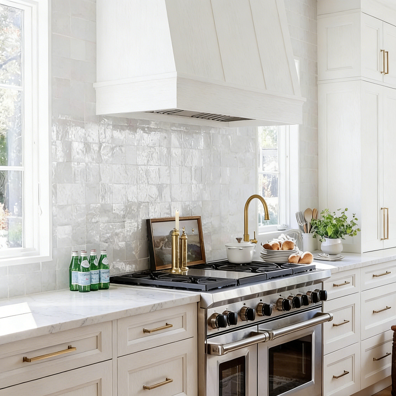 Cocina Americana Clásica Balom con Gabinetes de Madera Maciza Oscura, Tiradores de Cobre, Encimera de Mármol Blanco y Estufa Profesional