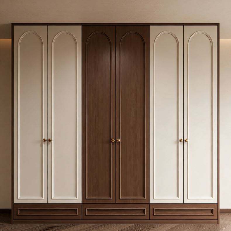 Armario de Lujo Integrado Personalizado Balom con Acabado Blanco Crema, Puertas con Detalles de Madera Oscura y Líneas Curvas