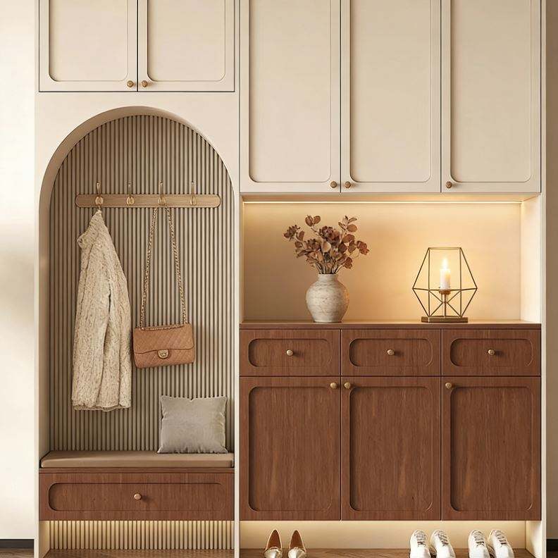 Armario de Estilo Francés Personalizado Balom con Gabinetes Blancos Crema, Módulos de Madera Oscura, Diseño de Exhibición y Almacenamiento con Vidrio Arqueado