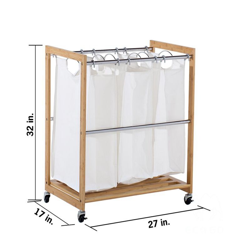 Clasificador de lavandería de 3 secciones de bambú, carrito de cesto de lavandería de 3 bolsas con ruedas bloqueables rodantes resistentes
