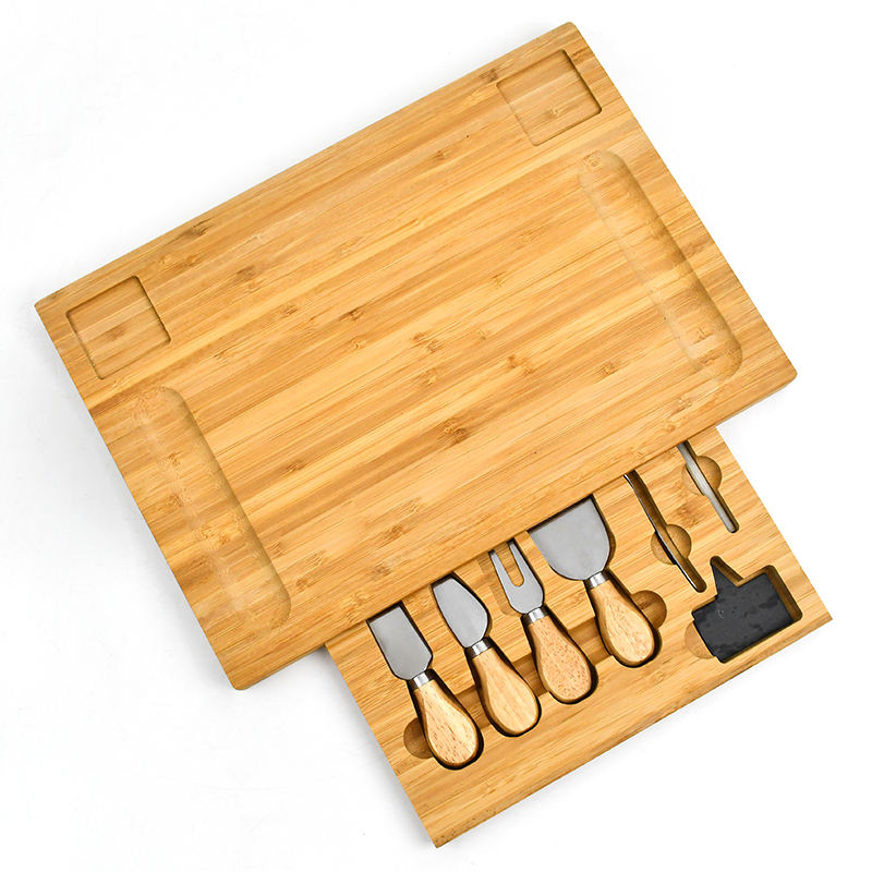 Tabla de Quesos de Bambú con Juego de Cuchillos, Cajón Deslizable, Tabla de Charcutería, Plato para Servir Vino, Carne y Queso, Deluxe