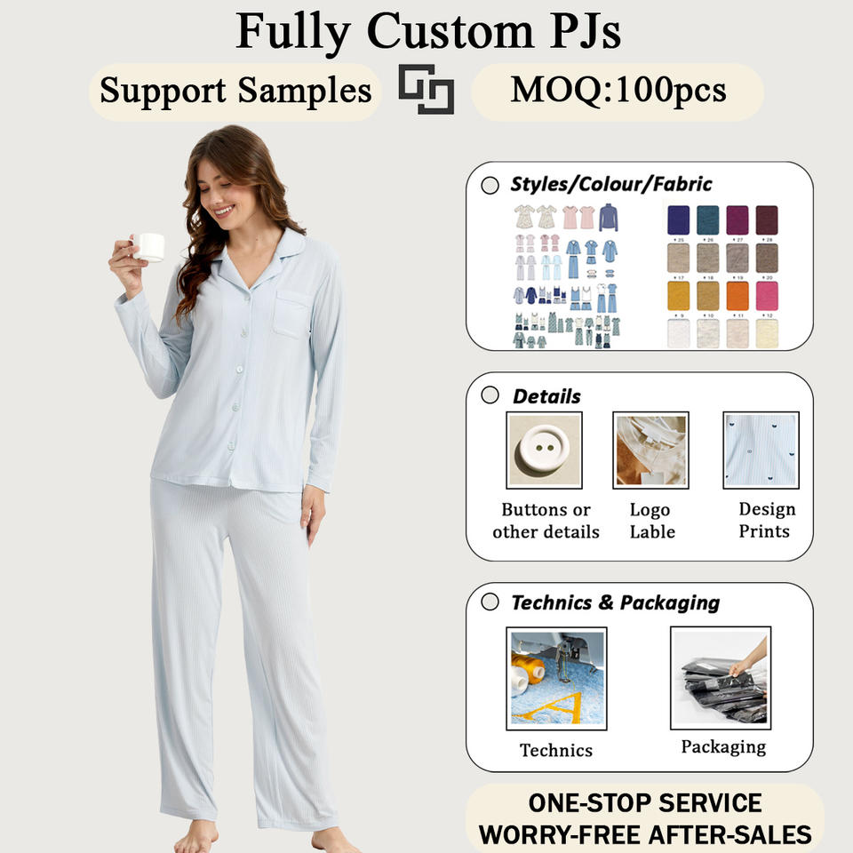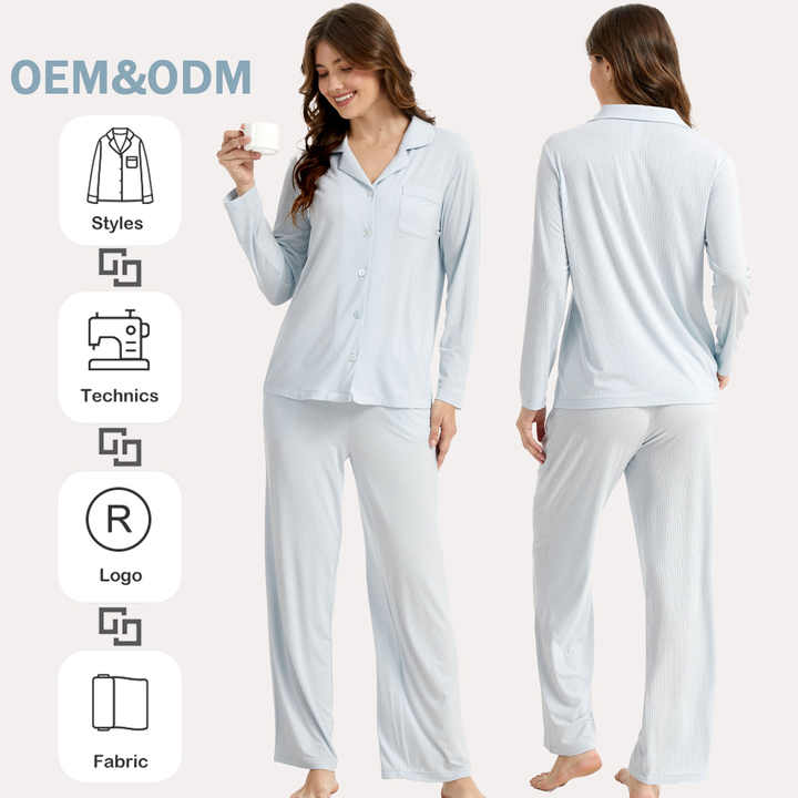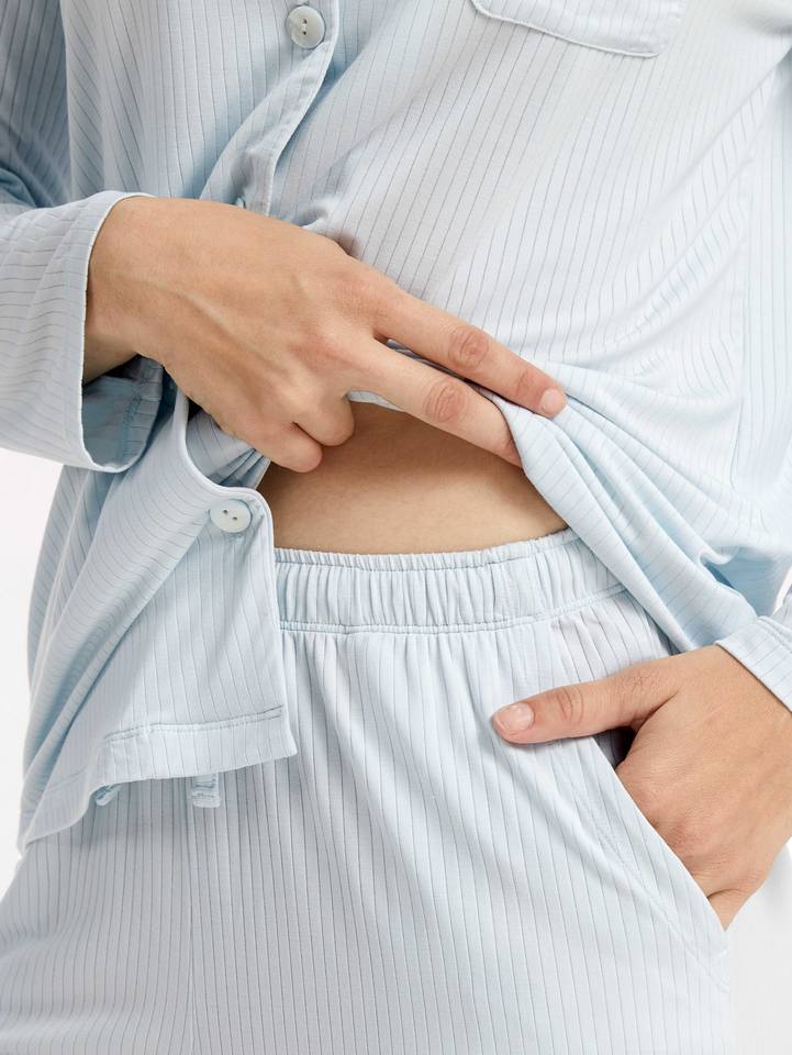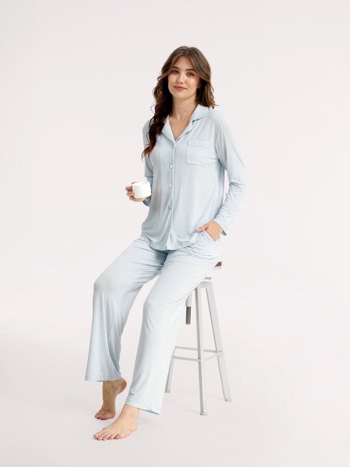 Conjunto de Pijama de Bambú con Rayas Azul Bebé, Camiseta de Manga Larga y Pantalones, Ropa de Dormir Transpirable para Mujer