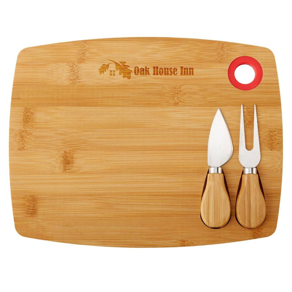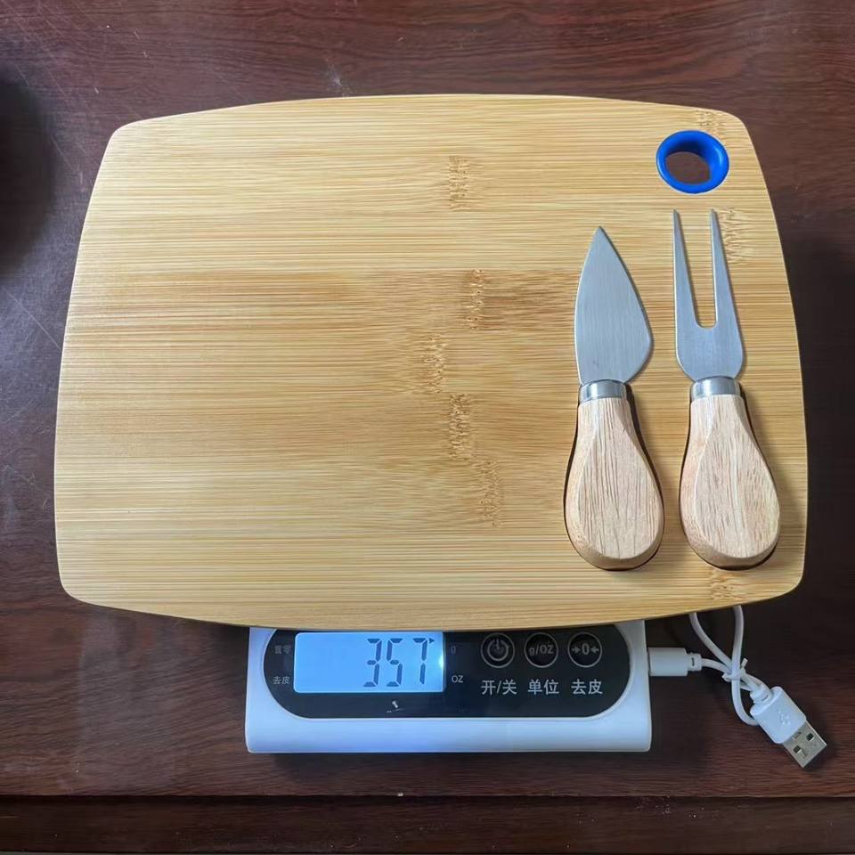 Juego de tabla de queso cuadrada de bambú, 2 manijas, tabla de cortar apta para lavavajillas para uso doméstico, incluye cuchillo, tenedor, diseño de trampa para pan