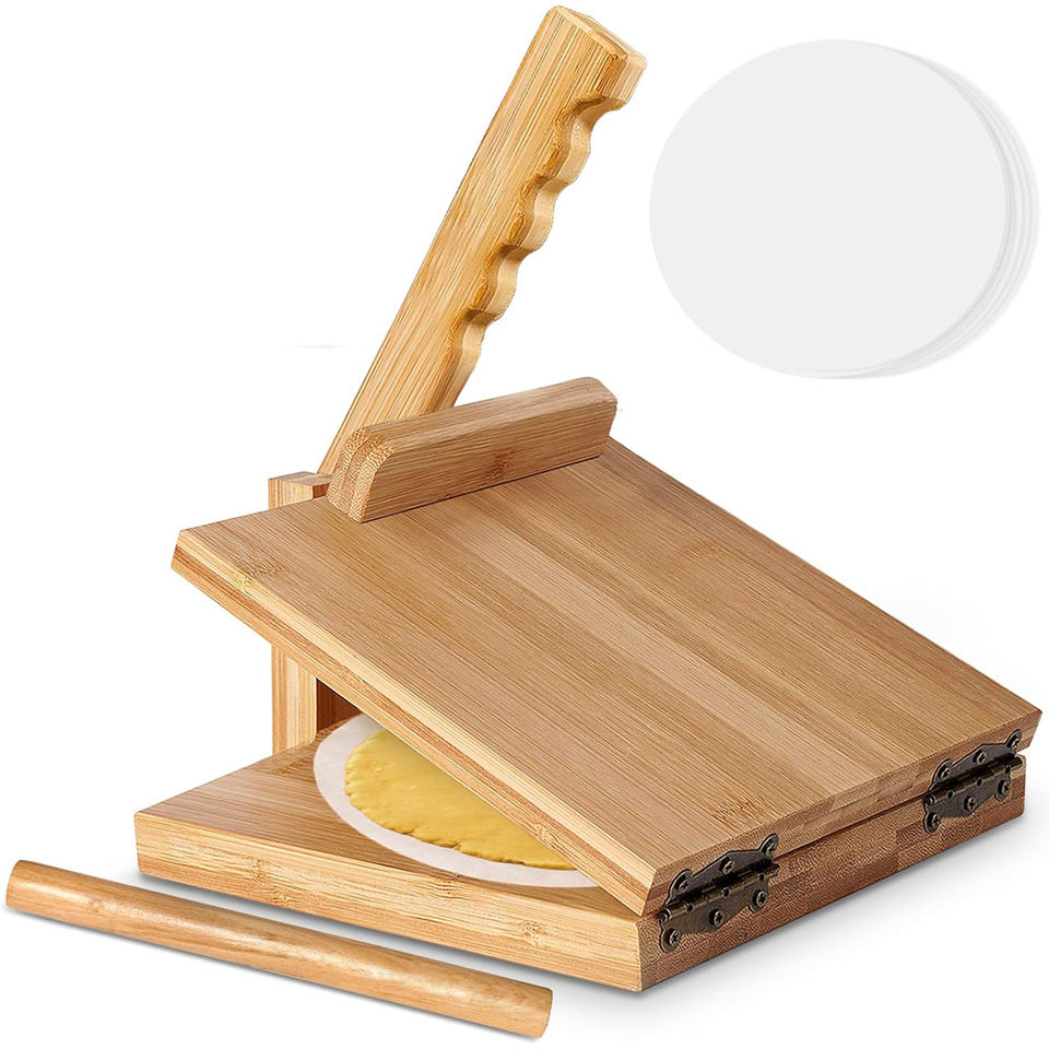Prensa de Bambú para Tortillas Roti de Madera con Rodillo Prensa Para Tortillas Caseras, Roti, Burritos,Taco