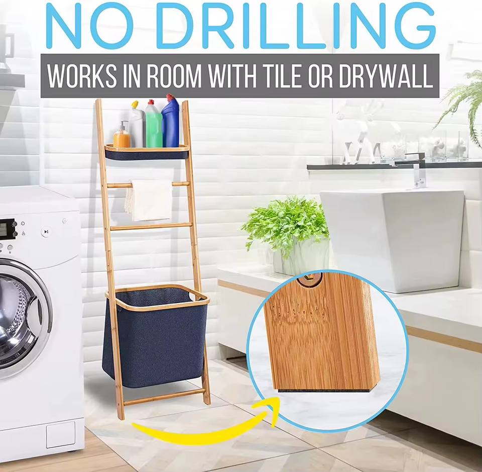Estante de escalera de bambú para toallas con barra de secado y cesto de tela para ropa sucia