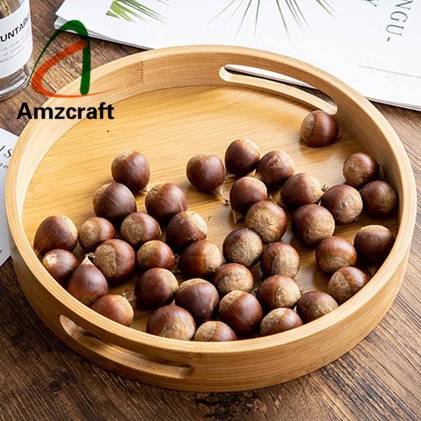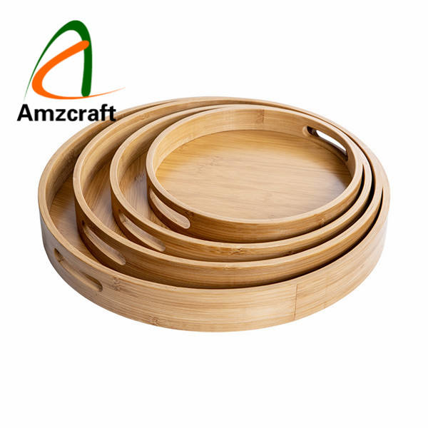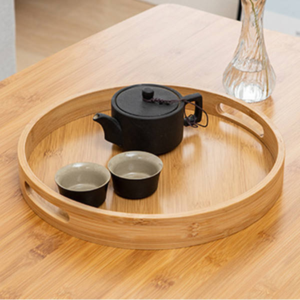 Bandeja para servir de madera de bambú al por mayor, organizador de almacenamiento de alimentos pulido natural suave con accesorios para café y té