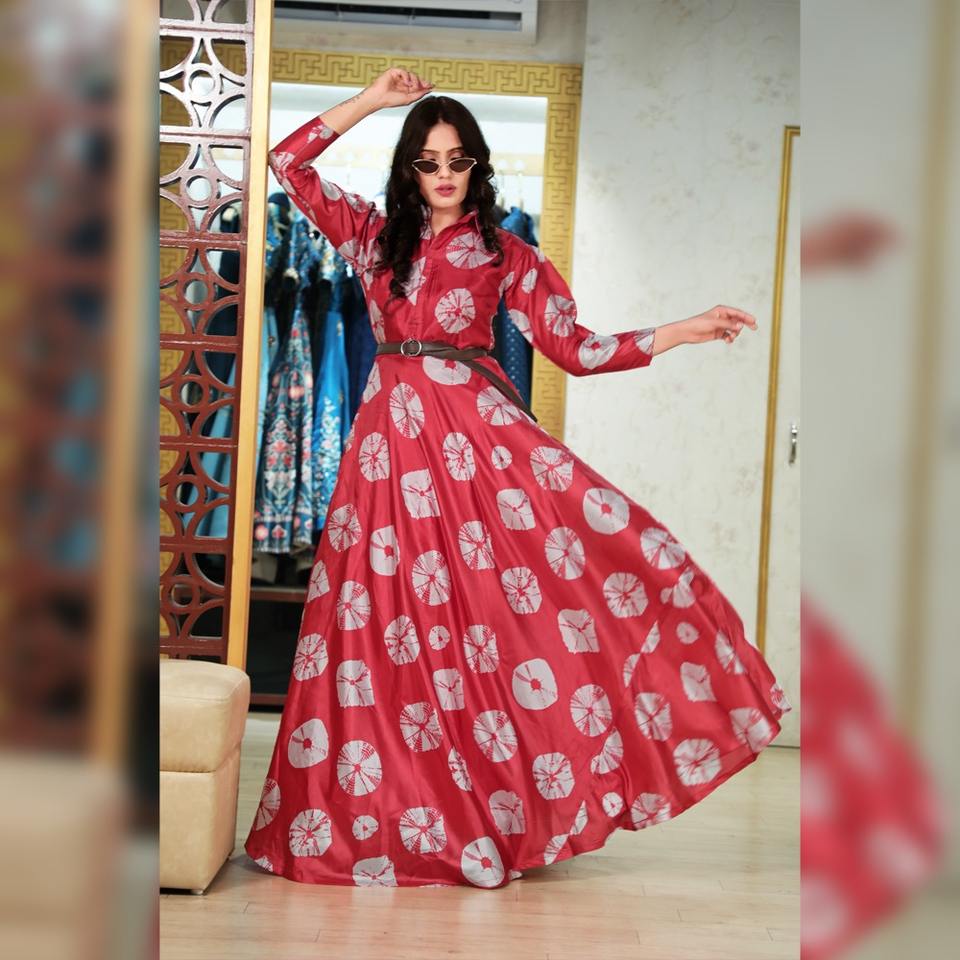 Bandhani-vestido de seda con colores Anarkali y Kurti, vestido elegante, tejido listo para usar, color rojo sangre, para manualidades indias