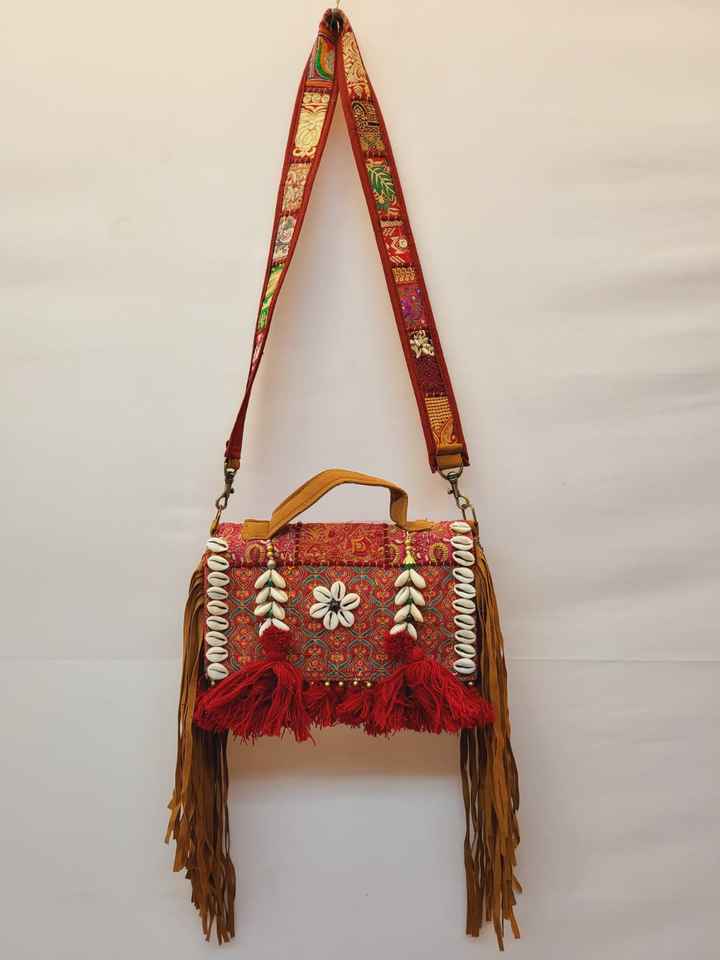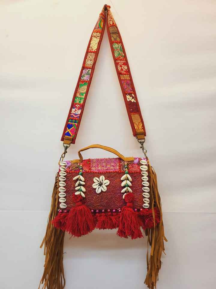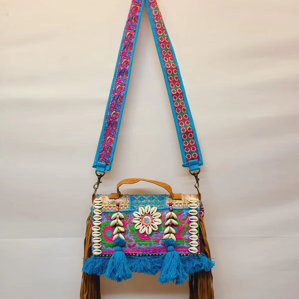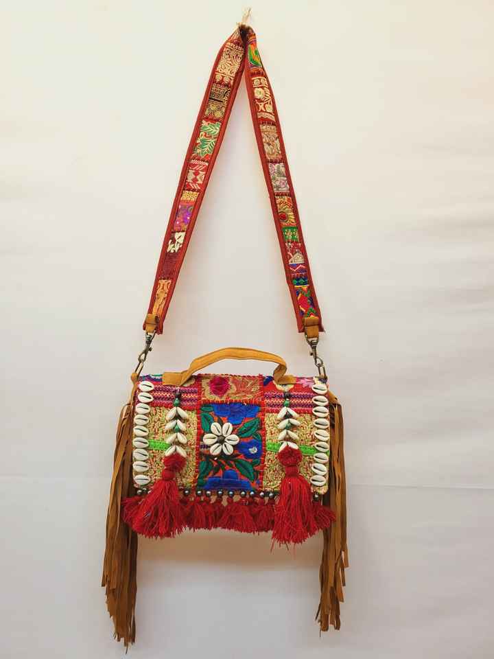 Bolso Banjara de retales ligero con cierre abierto y decoración bordada, función plegable