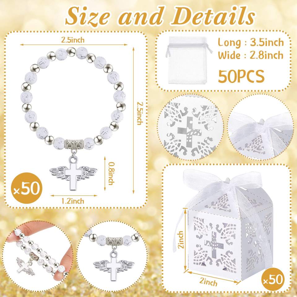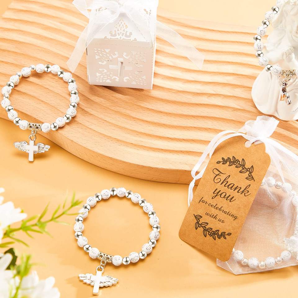 Recuerdos de Bautizo: Pulsera de Rosario con Cruz de Ángel, Cajas de Recuerdos de Bautizo con Cinta, Etiquetas de Agradecimiento, Bolsas de Organza