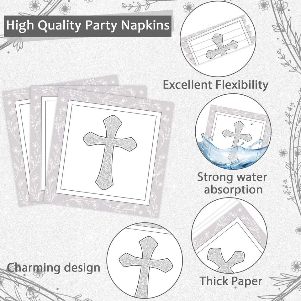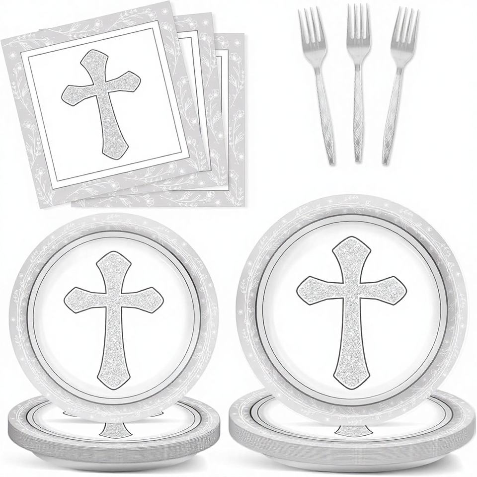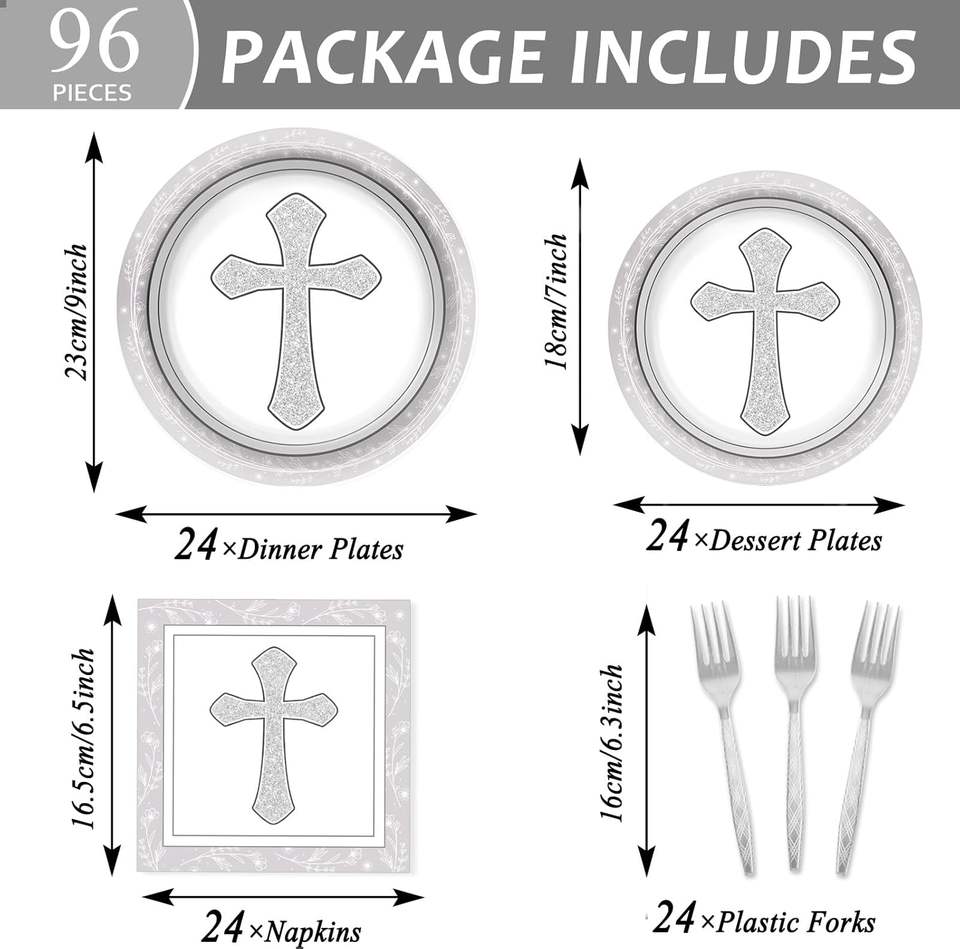 Juego de Vajilla para 24 Invitados con Servilletas y Platos de Postre con Cruz para Bautizo y Primera Comunión, Color Gris, Artículos Religiosos para Fiestas