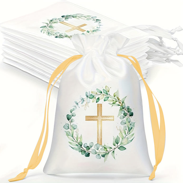 Bolsas de regalo de satén para bautismo con cordón, bolsas de regalo religiosas, bolsas de joyería de dulces cruzados para bautismo, recuerdo de fiesta de primera comunión