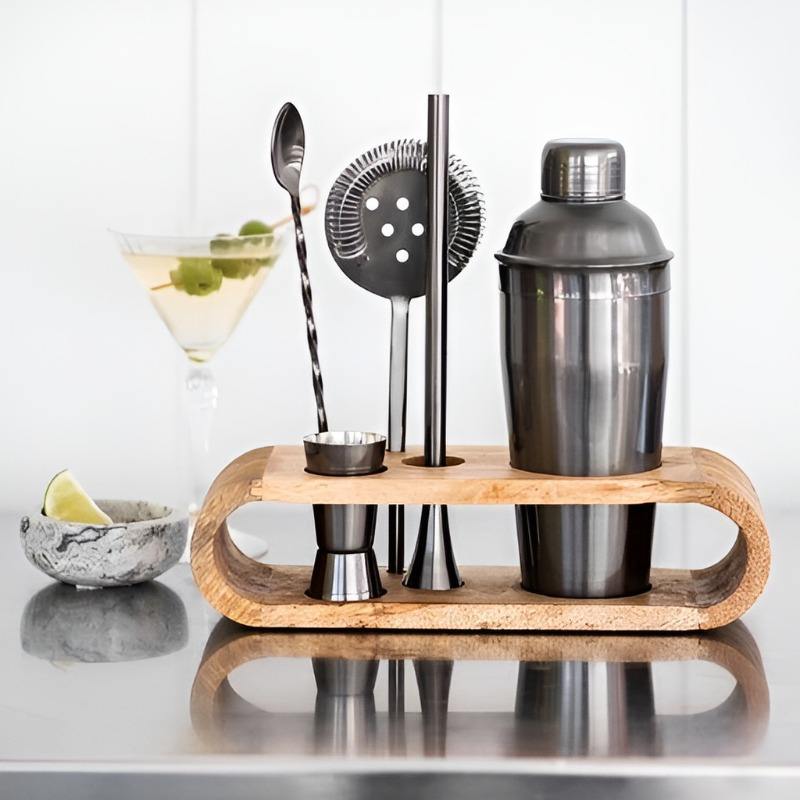 Juego de Accesorios para Bar, Kit de Barman con Soporte, Coctelera, Jigger y Colador, Juego de Utensilios de Bar de 4 Piezas Hechas de Acero Inoxidable de Grado Alimenticio