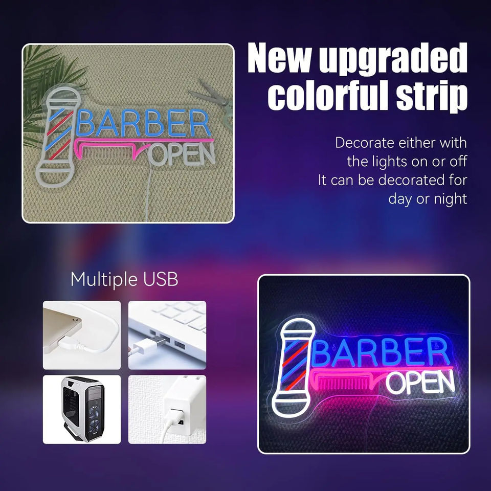Letrero LED de Neón Abierto para Barbería, con USB y Regulable, para Exhibición en Ventana, Salón de Belleza, Barbería, Sala de Estar, Tienda, Decoración de Pared