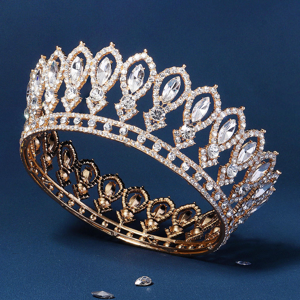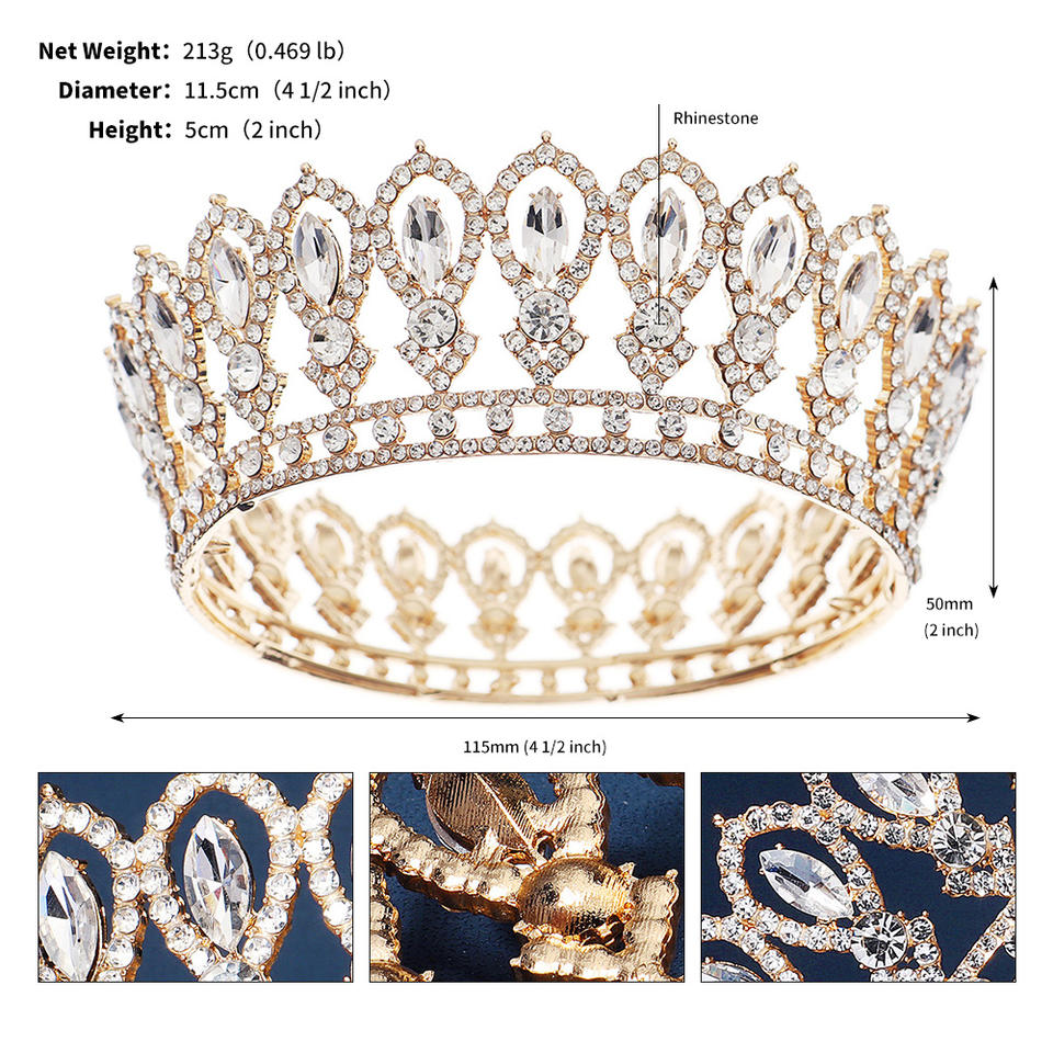 Diademas barrocas redondas de oro para desfile, tiara de cristal con diamantes de imitación, moldura de corona para rey Queens y novia