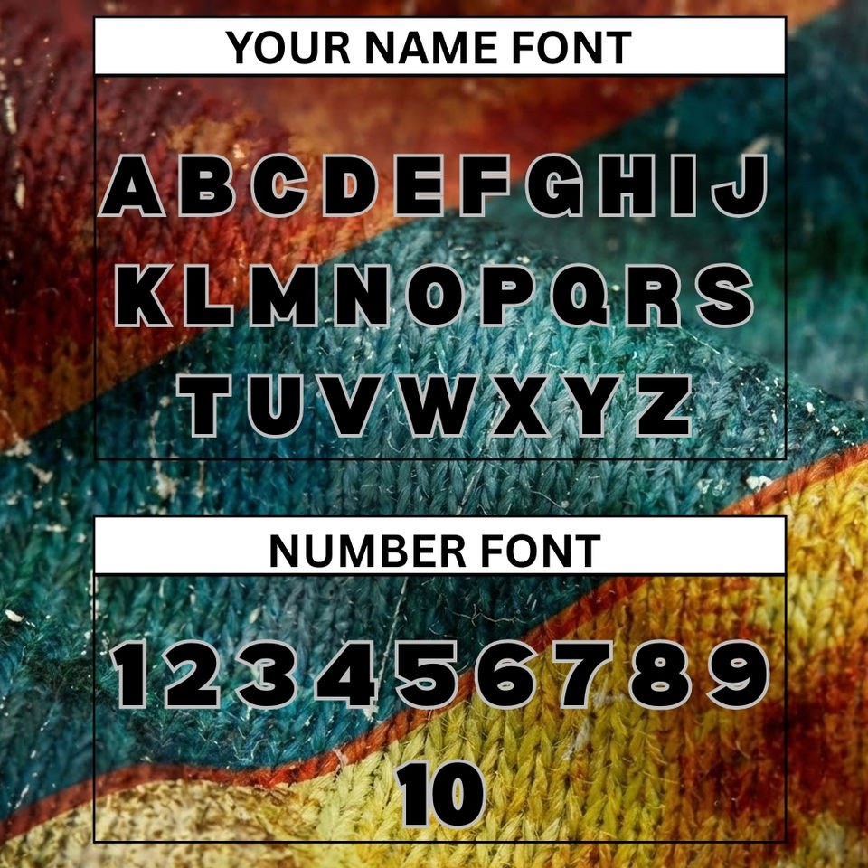 Tipo de diseño:Sólido, Personaje, Imprimir, Carta, Nombre del jugador, Nombre del equipo, Números de equipo
