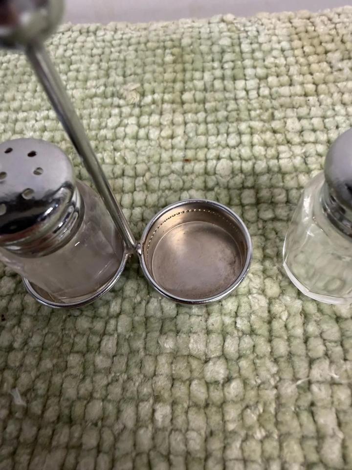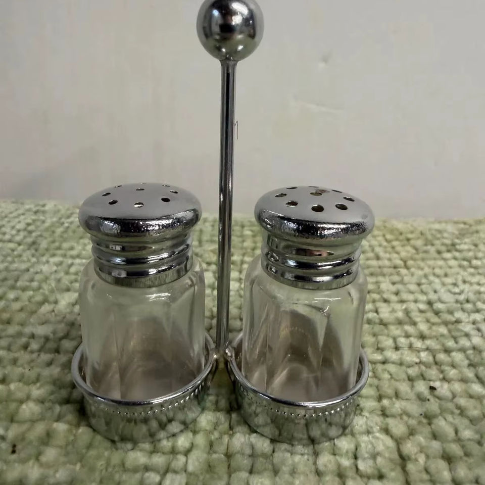 Juego básico de salero y pimentero de metal y vidrio para uso diario en la mesa, para añadir fácilmente sal y pimienta durante las comidas.