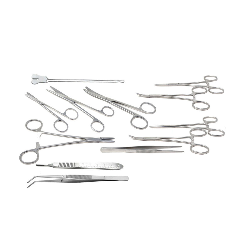 Kit básico de cirugía menor Caja de acero inoxidable de 13 piezas Instrumentos quirúrgicos Fuente de alimentación manual Fórceps de calidad Plástico