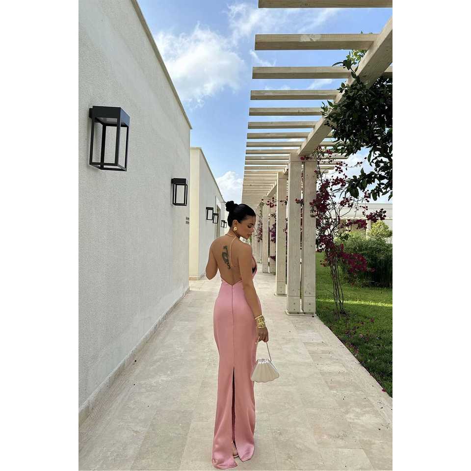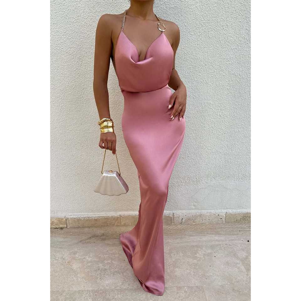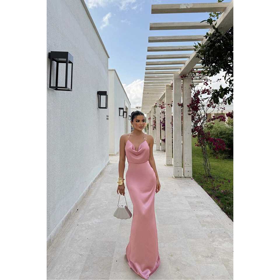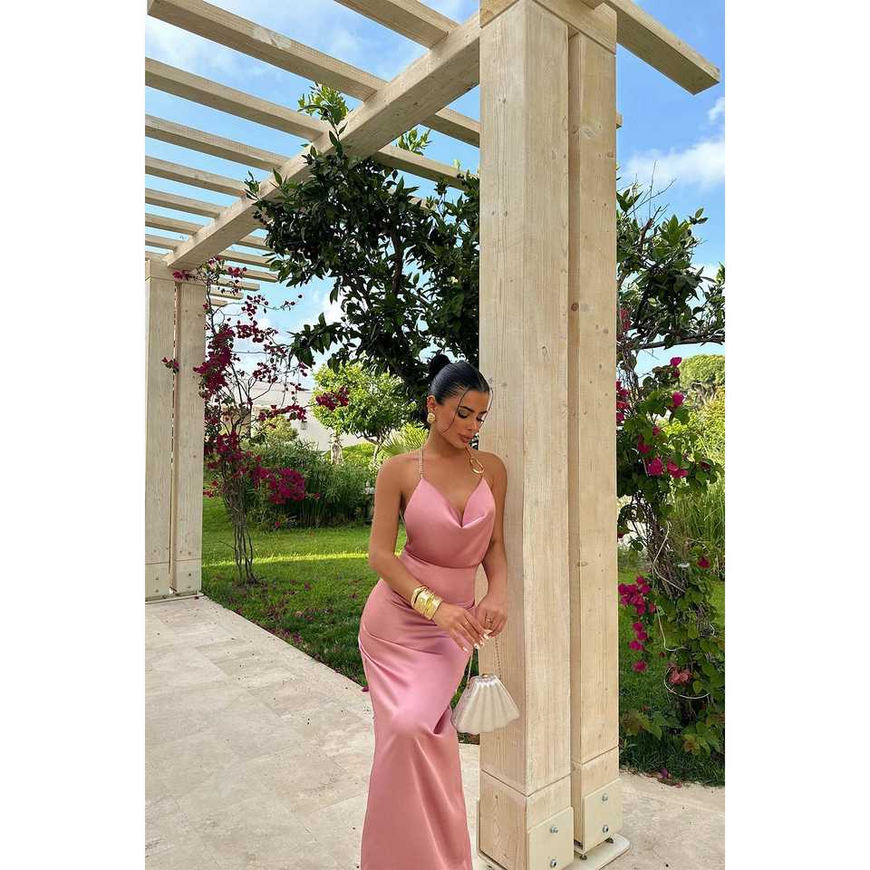 Vestido de Noche Básico Rosa Palo, Estilo Princesa, con Detalle de Lentejuelas en la Espalda, Tirantes Espagueti, Largo hasta el Suelo, Corte en A, Talla XS, para Fiestas
