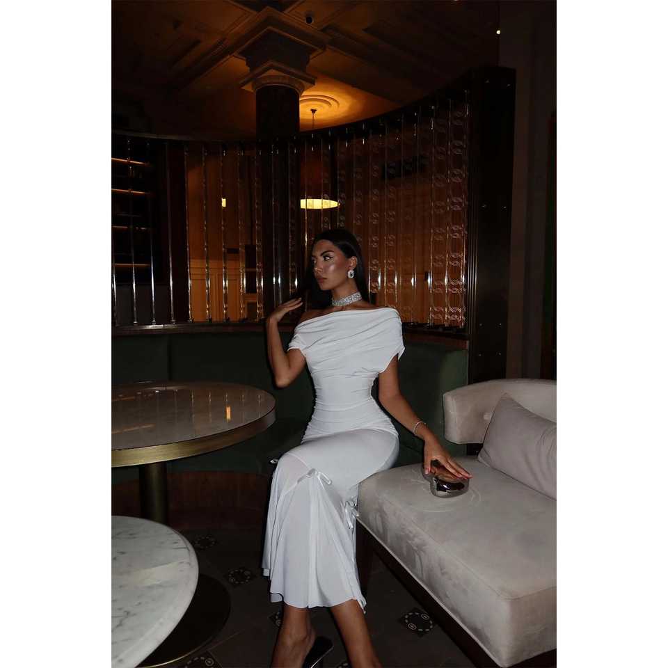 Vestido de Noche Blanco Básico con Detalle de Volantes