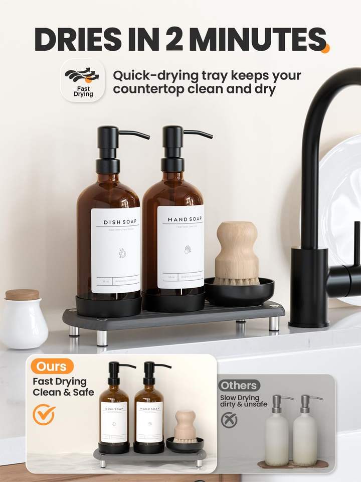 Juego de baño-Botella de vidrio ámbar de 16oz, bandeja de secado instantáneo, etiquetas impermeables, almohadilla de silicona antideslizante y cepillo para platos.