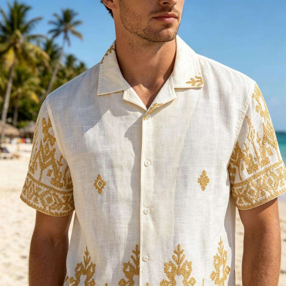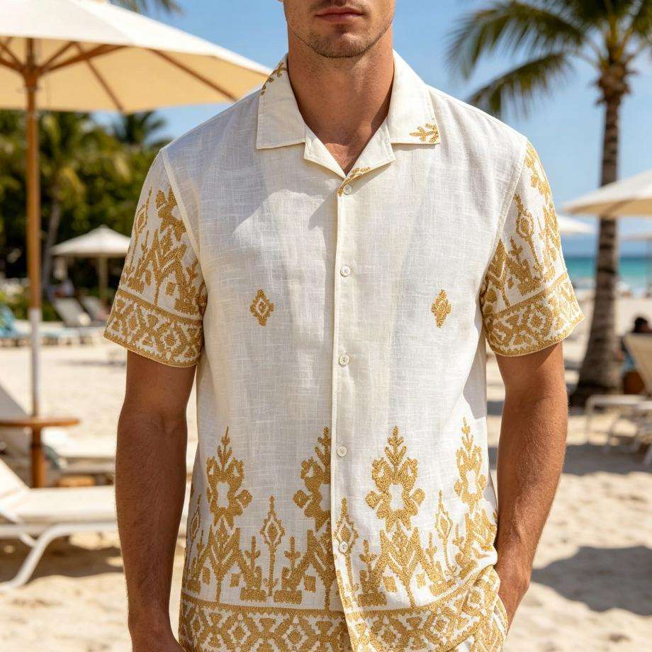 Camisa de lino y algodón con bordado de estampado floral para hombre, camisa informal de manga corta para hombre, camisas de vacaciones en la playa para hombre