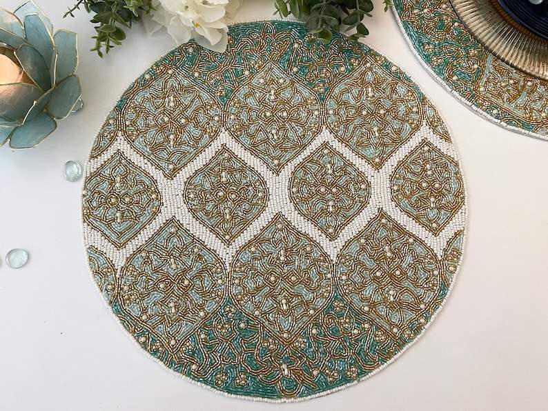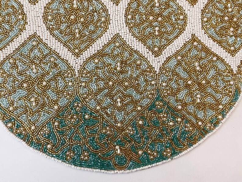 Mantel Individual con cuentas, cargador redondo hecho a mano para comedor de lujo y decoración de vacaciones, pieza única hecha a mano con cuentas, mantel, inauguración de la casa