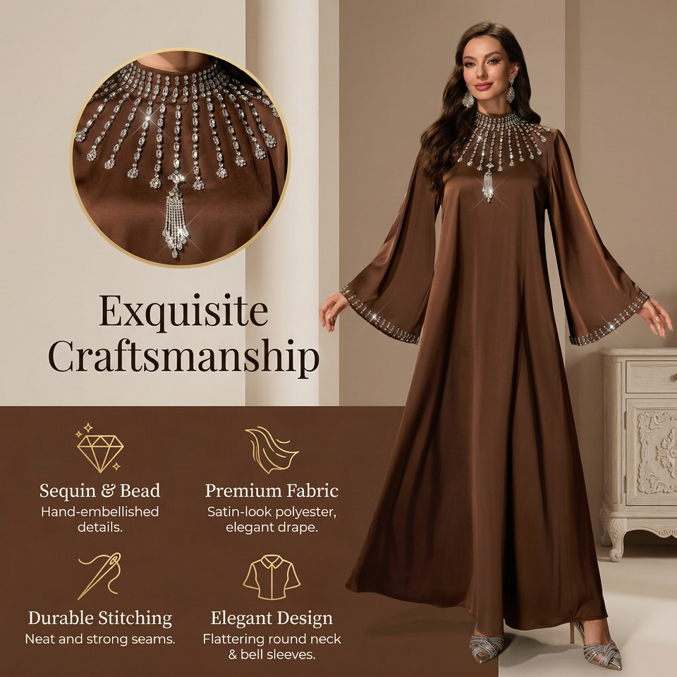 Abaya Modesta con Cuentas y Pedrería para Mujer, Manga Ancha, Marca Privada
