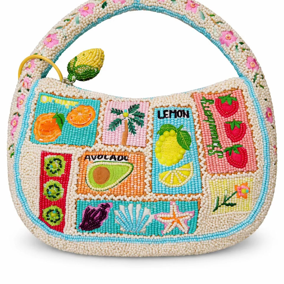 Beaded fruit patchwork handbag with charm detail Perfect for Evening Wedding and Casual Use Available For Sale