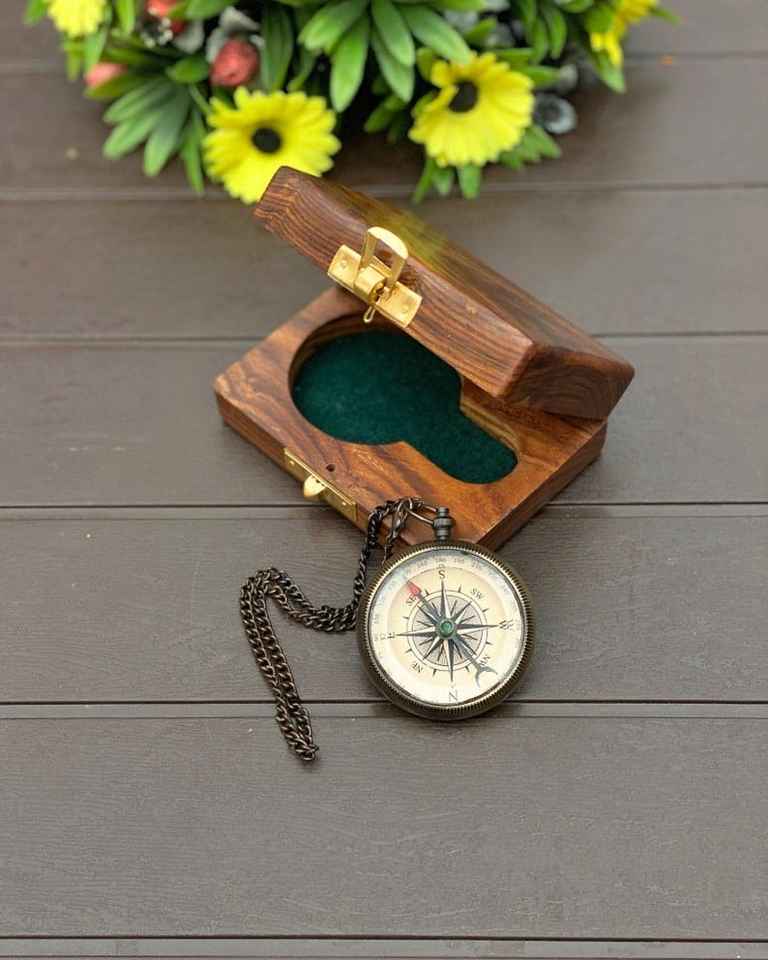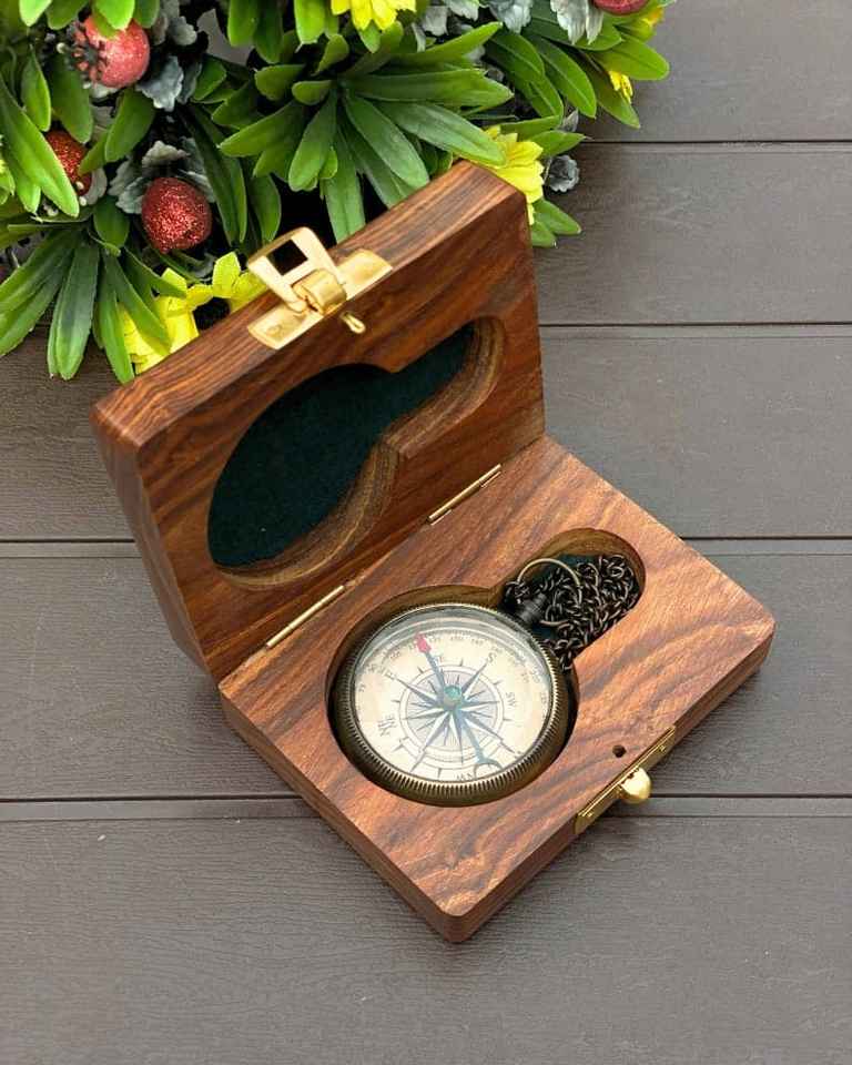 Hermosa brújula magnética de latón, caja de madera de tamaño personalizado, modo de llavero, puntero de caza para navegación marítima para acampar y hacer senderismo