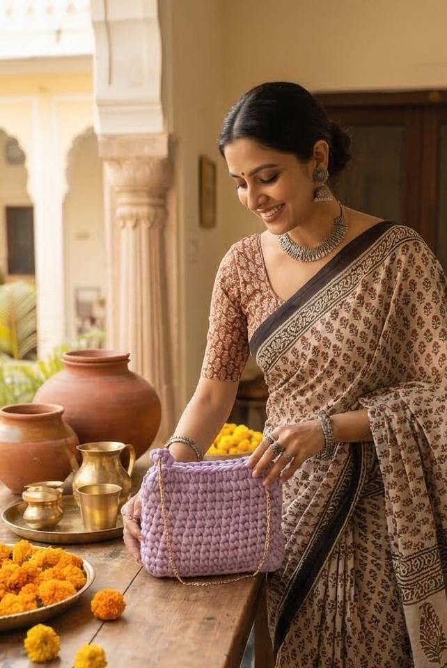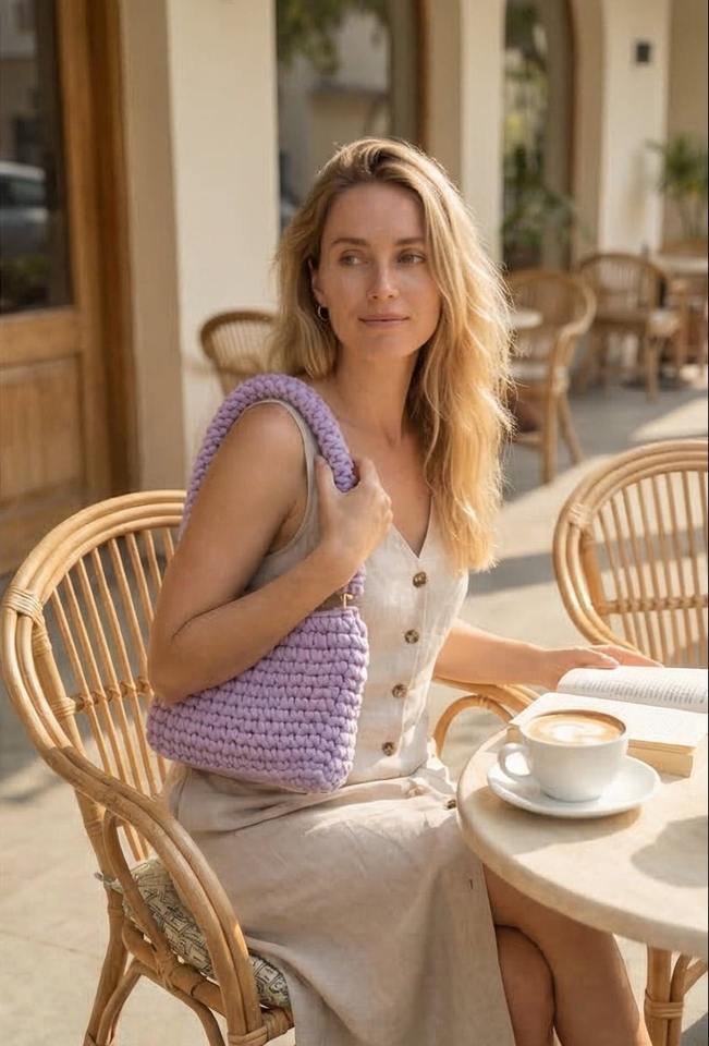 Hermosa Mini Bolsa de Cadena – Bolso Lavanda Trenzado Hecho a Mano con Perlas y Dos Correas, Bolso de Hombro Boho de Cordón de Algodón Tejido