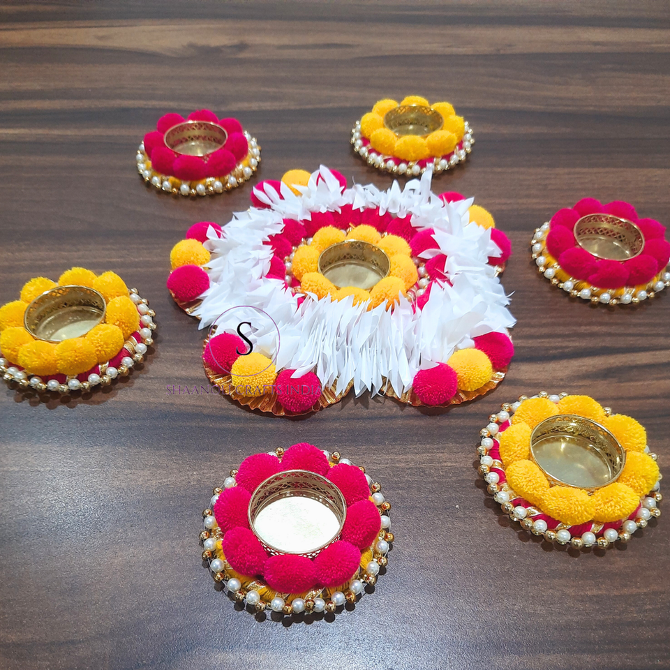 Hermoso diseñador Pompom Floral Rangoli Set Portavelas Luz de té con flores de jazmín Titulares para el hogar Nuestra decoración del festival