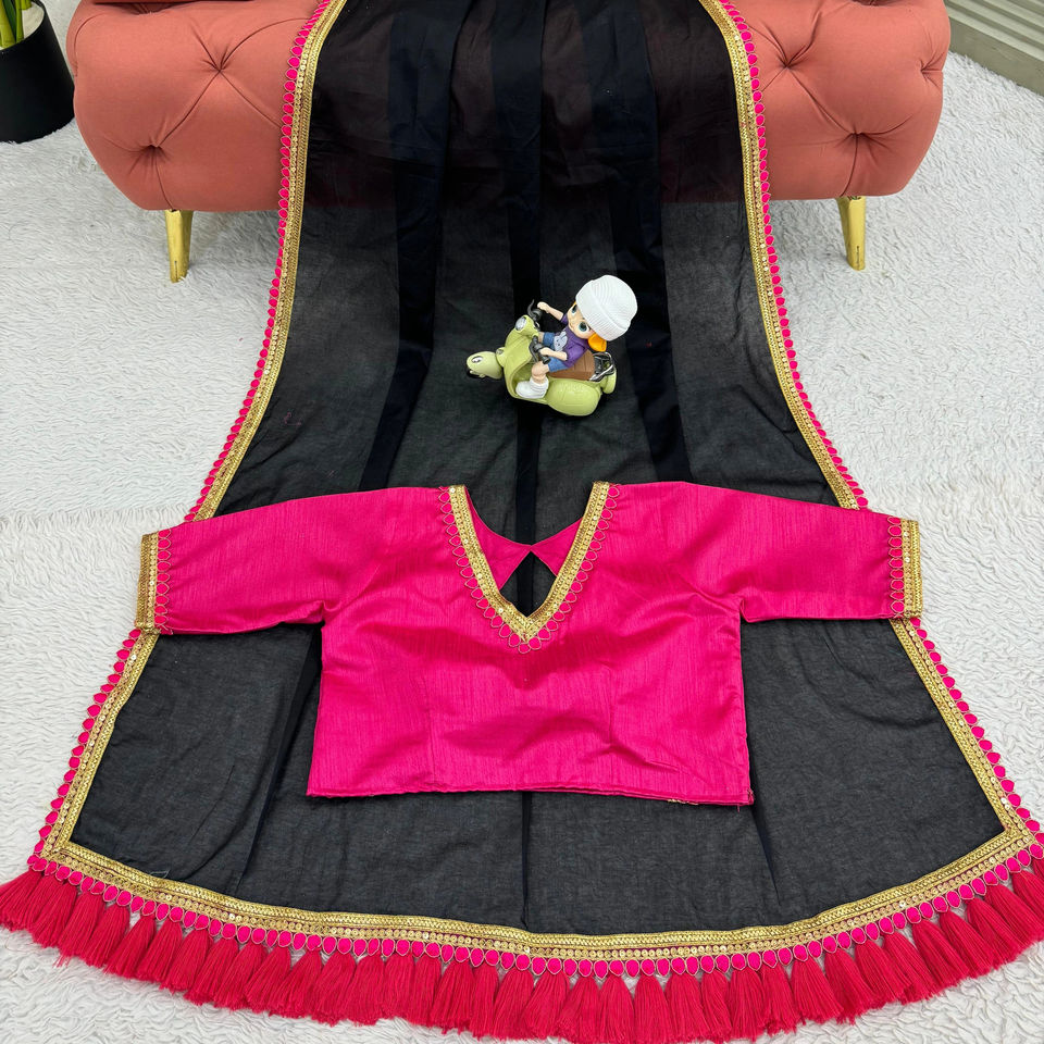 Hermoso Sari de diseñador con encaje elegante y Latkan pesado en pallu y blusa