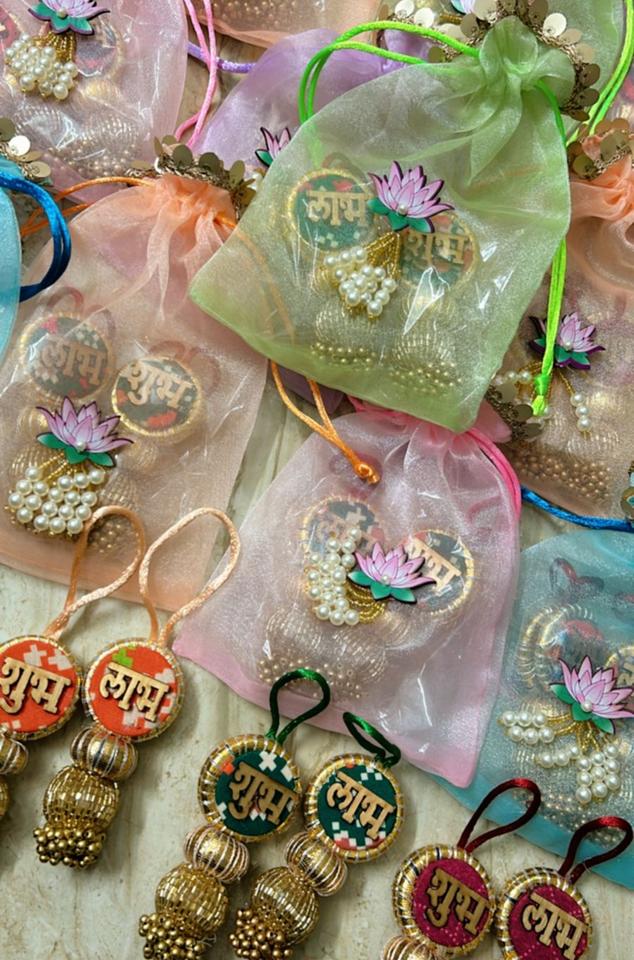Nombre del producto:Doble lado Shubh Labh colgante con Organza Potli Set de regalo