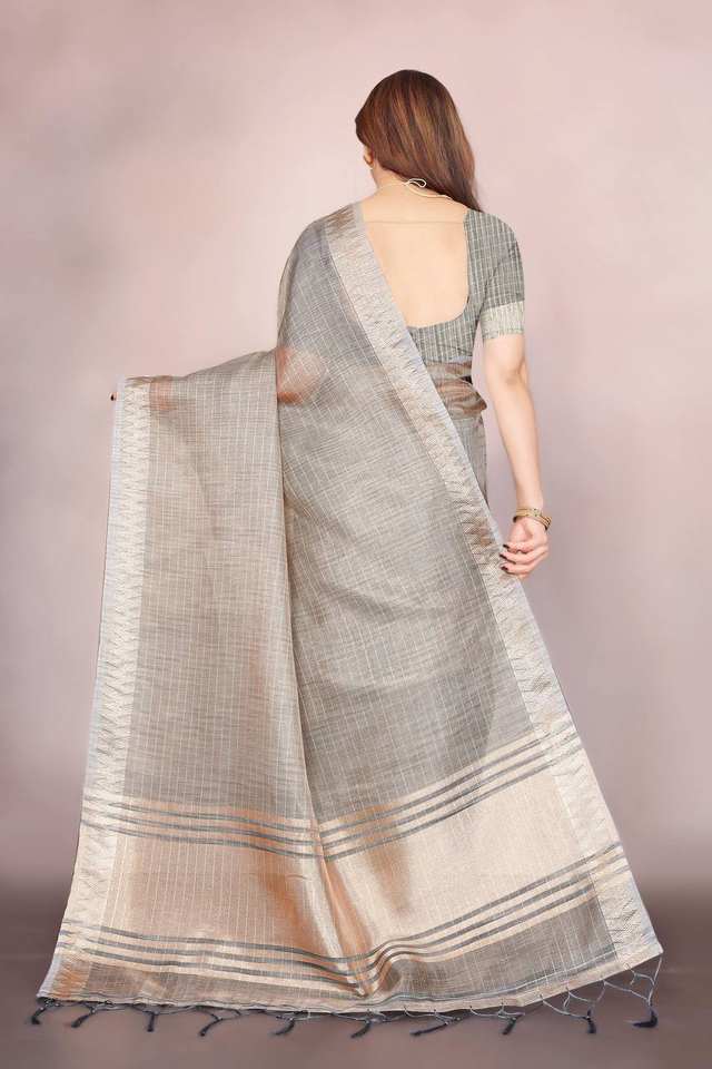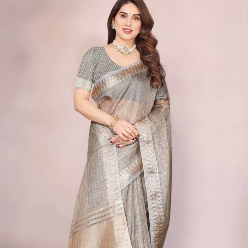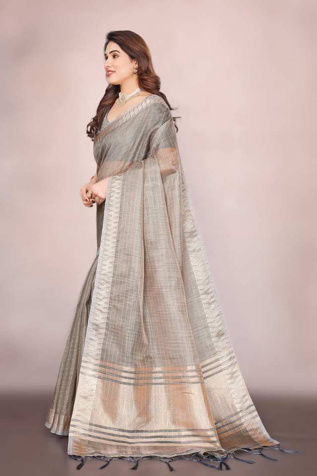 Hermosa colección de Sari establecida con trabajo de secuencia de bordado y diseño tejido Borde de jacquard para ropa de mujer india