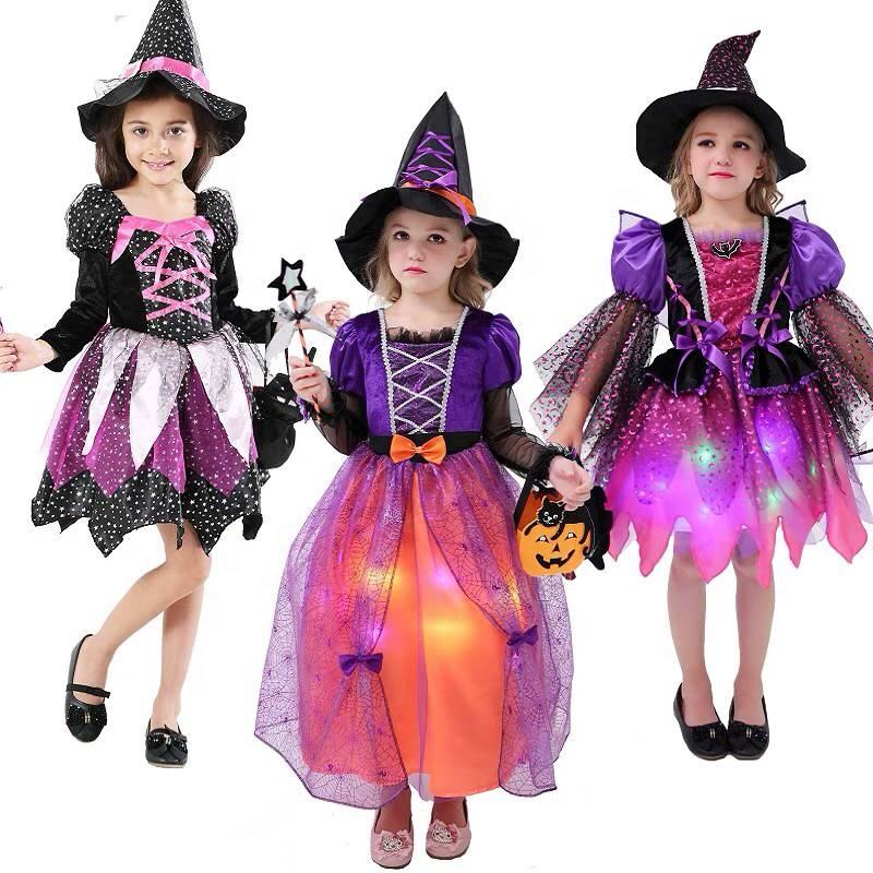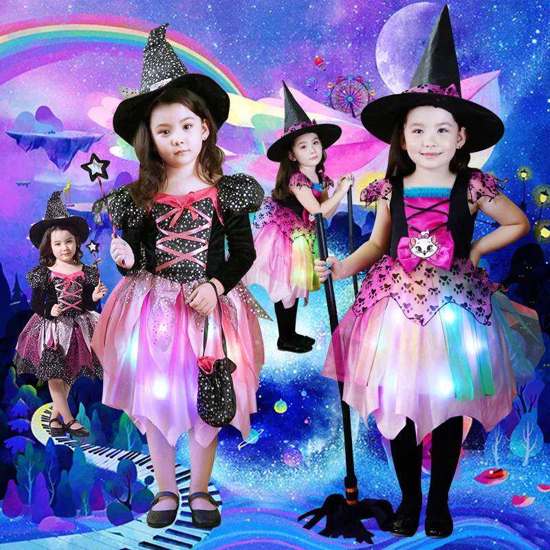 Hermoso disfraz elegante de brujas para niños con luz Led para niñas Halloween
