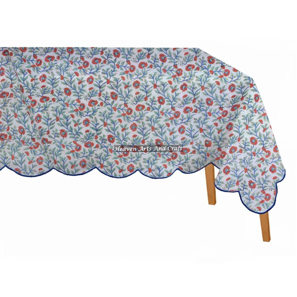 Hermosa Cubierta de Mesa Rectangular de Algodón con Estampado Floral a Mano, Técnica de Tejido Scallop para el Hogar y Fiestas, Tela de Algodón Puro