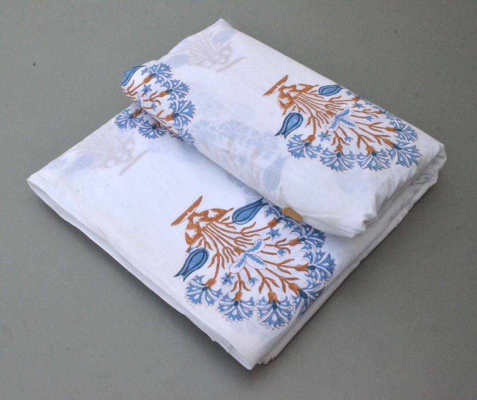 Tela de Algodón Estampada a Mano en Blanco y Azul con Motivo Floral Tradicional – Algodón Indio Suave y Transpirable por Yarda