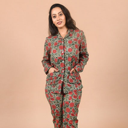 Nombre:Hermoso bloque de mano impreso Pijama de algodón conjunto