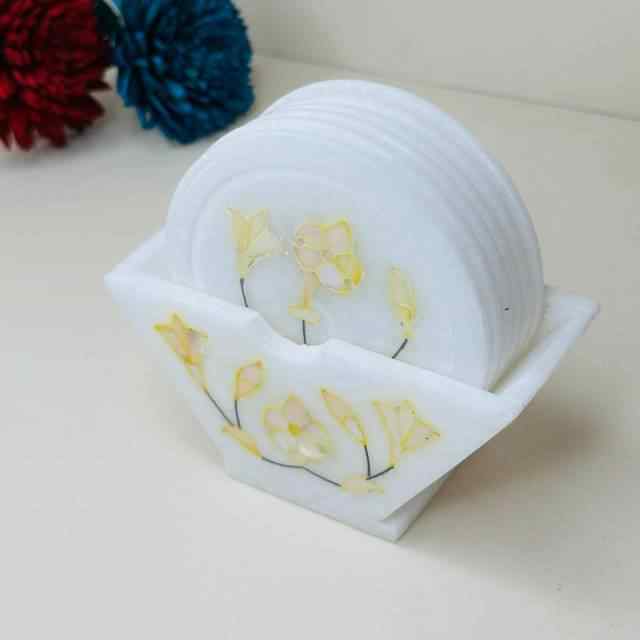 Hermoso posavasos de té amarillo hecho a mano de 9x9cm con incrustaciones de mármol con patrón de modelo pintado, producto artesanal de piedra de venta completa