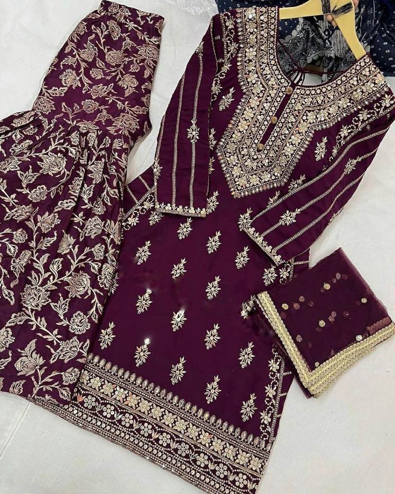 Hermoso Conjunto Kurta Sharara de Diseño Étnico Moderno Multicolor con Bordado en Georgette Sintético Hecho a Mano para Bodas y Eventos