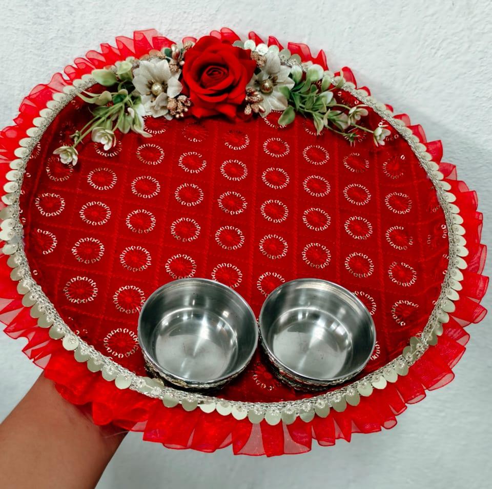 Hermoso juego de thali rojo hecho a mano para puja, el más vendido, bandeja decorativa para Roli y Kumkum, regalo festivo con tazones, para bodas y Diwali